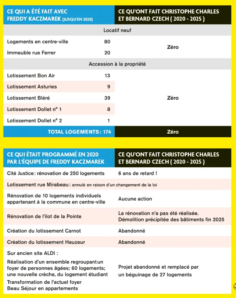 Comparaison l’action de Freddy Kaczmarek et son équipe et celle de l’actuelle municipalité depuis six ans.